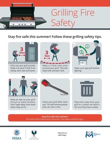 For information on how to grill safely, visit the National Fire Protection Association (NFPA) grilling and cooking sites, and the US FEMA site.